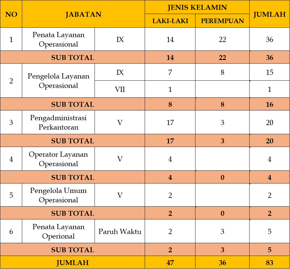 Gambaran umum Pegawai Pemerintah dengan Perjanjian Kerja (PPPK) tahun 2025 berdasarkan jenis kelamin serta status kerja penuh waktu dan paruh waktu. Secara keseluruhan, jumlah PPPK laki-laki lebih banyak (47 orang) dibandingkan perempuan (36 orang). Jabatan Penata Layanan Operasional Ahli IX didominasi oleh perempuan, sementara Pengadministrasi Perkantoran V didominasi oleh laki-laki. Pada beberapa jabatan lain seperti Pengelola Layanan Operasional IX, jumlah laki-laki dan perempuan relatif seimbang. Data ini menunjukkan adanya variasi komposisi gender pada setiap jabatan, namun secara umum laki-laki masih mendominasi total jumlah PPPK.