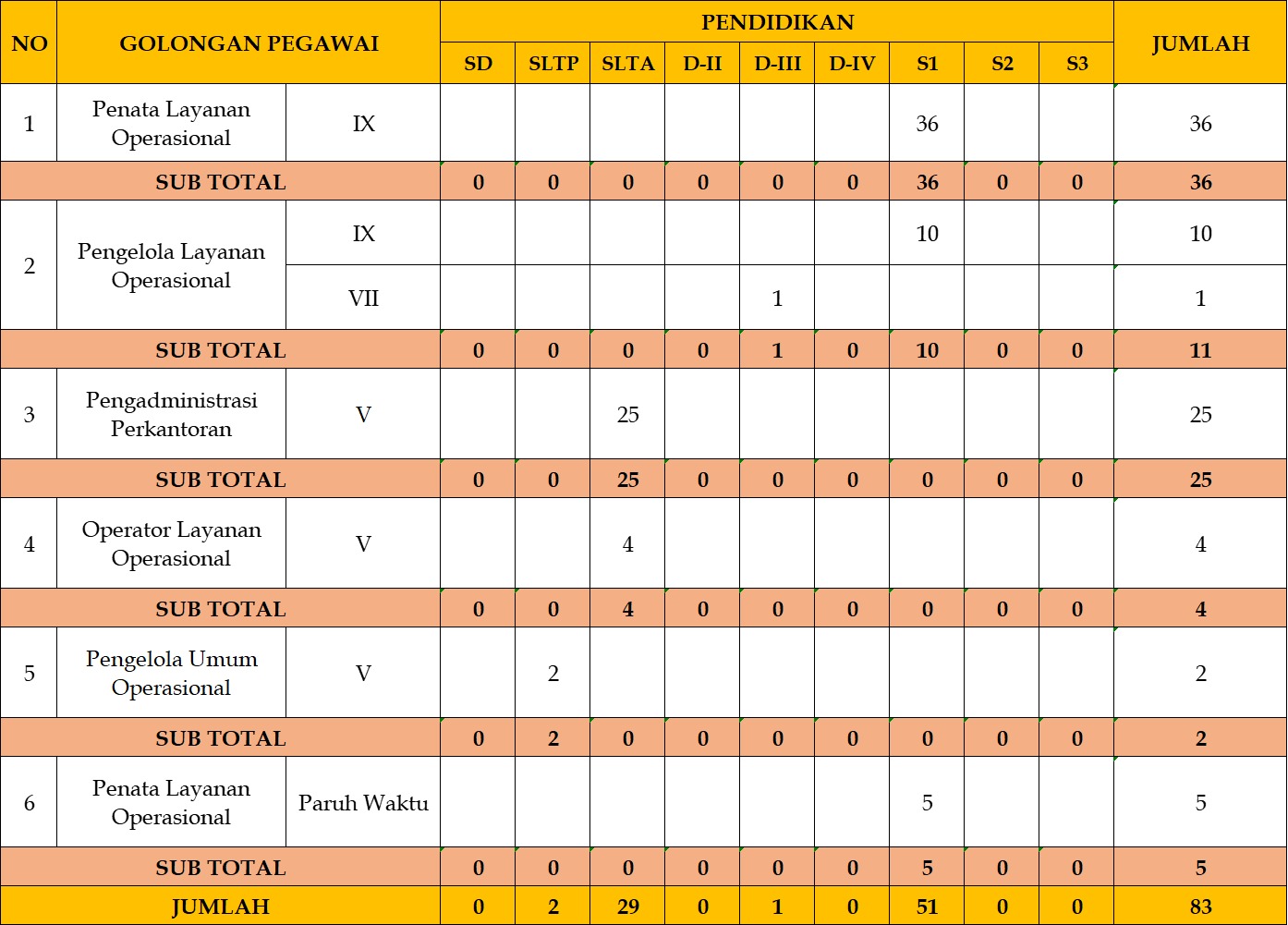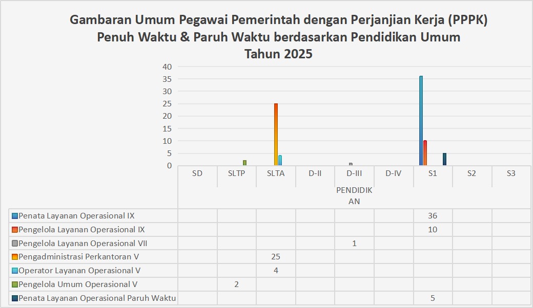 Gambaran umum Pegawai Pemerintah dengan Perjanjian Kerja (PPPK) tahun 2025 berdasarkan tingkat pendidikan umum. Secara keseluruhan, mayoritas PPPK memiliki latar belakang pendidikan Strata 1 (S1), terutama pada jabatan Penata Layanan Operasional IX yang jumlahnya paling dominan. Selain itu, terdapat pula PPPK dengan pendidikan SLTA, khususnya pada jabatan Pengadministrasi Perkantoran V dan Operator Layanan Operasional V. Sementara itu, jumlah PPPK dengan pendidikan diploma (D-II hingga D-IV) serta pascasarjana (S2 dan S3) relatif sangat sedikit. Hal ini menunjukkan bahwa kebutuhan PPPK saat ini lebih banyak diserap dari lulusan S1 dan SLTA sesuai dengan karakteristik jabatan yang tersedia.