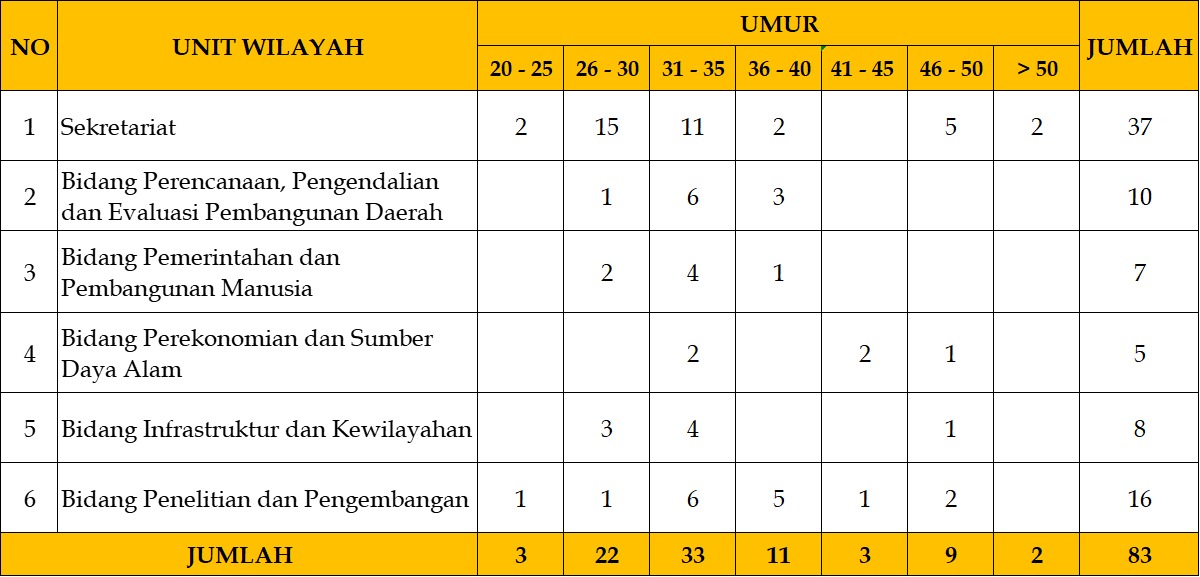 Pegawai Pemerintah dengan Perjanjian Kerja (PPPK) penuh waktu dan paruh waktu menurut kelompok umur tahun 2025. Secara umum, jumlah PPPK paling banyak berada pada kelompok umur 26–30 dan 31–35 tahun, yang menandakan dominasi usia produktif. Sekretariat menjadi unit dengan jumlah PPPK terbanyak di hampir seluruh kelompok umur, diikuti oleh Bidang Perencanaan, Pengendalian dan Evaluasi Pembangunan Daerah serta Bidang Penelitian dan Pengembangan. Sementara itu, pada kelompok umur di atas 45 tahun jumlah PPPK relatif lebih sedikit, menunjukkan komposisi pegawai yang cenderung muda dan potensial untuk pengembangan kinerja jangka panjang.